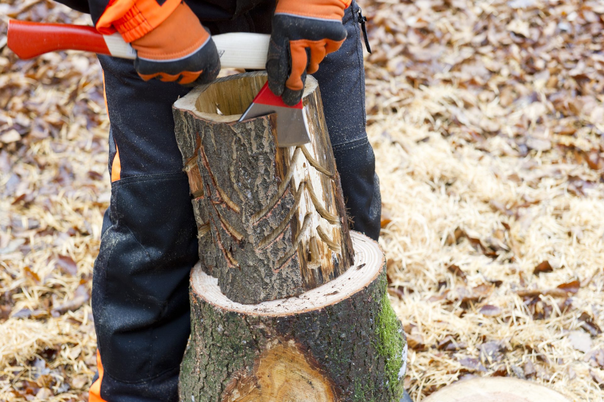 Ještě, než začnete, uvědomte si, že i při umělecké práci s motorovou pilou je třeba myslet na osobní ochranné pomůcky. Ochranné brýle nebo obličejový štít jsou samozřejmostí, stejně tak pracovní rukavice a kalhoty s ochranou proti proříznutí.