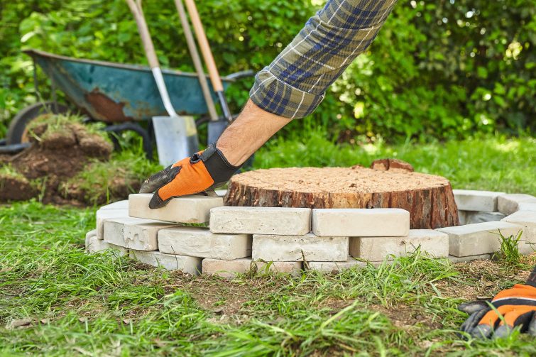 Připravte si motorovou pilu, zkontrolujte hladinu oleje a nasaďte si ochranné pomůcky. Vyřežte do pařezu mřížku, jejíž čtverce mají délku strany přibližně pět centimetrů. Rýhy můžete řezat dvakrát a hlouběji, jen dávejte pozor na kontakt s půdou, který pilu okamžitě otupí. Ukliďte pilu a vezměte si rýč. Vykopejte kolem pařezu ve vzdálenosti asi 30 centimetrů mělký příkop s vodorovným dnem, který by měl být širší než cihly nebo kameny, z nichž budete stavět boky. Vzhledem k tomu, že záhon, který právě budujete, bude sloužit pouze tak dlouho, dokud pařez neshnije, není nutné podkládat kameny nebo cihly drtí a můžete je jednoduše zatlouct rovnou do země. Jen pokud je půda velmi sypká, tak ji nejprve udusejte.