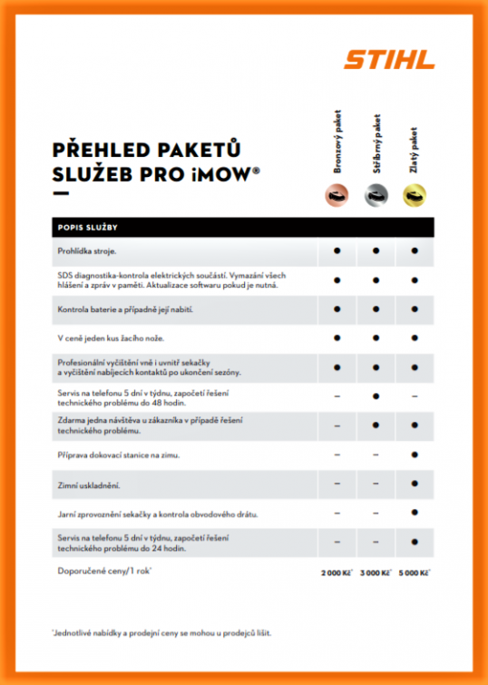 Přes všechny své výhody potřebují sekačky řady iMOW® trochu specializované péče navíc. Ať už se jedná o zazimování dokovací stanice i samotné sekačky, správné nastavení žacích programů nebo pravidelné kontroly obvodových drátů. S řešením ale přichází nová servisní služba, která se vám za roční paušál postará o všechnu práci spojenou s údržbou sekačky. Vybrat si můžete ze tří úrovní servisu – bronzového, stříbrného a zlatého paketu.