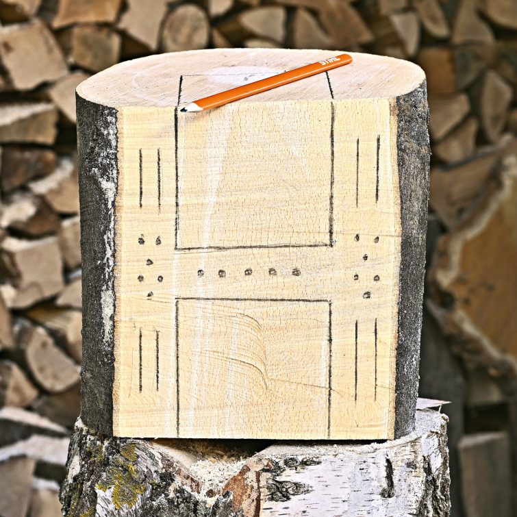 Nejprve odřízněte ze špalku plát dřeva, který bude sloužit jako spodní kryt.