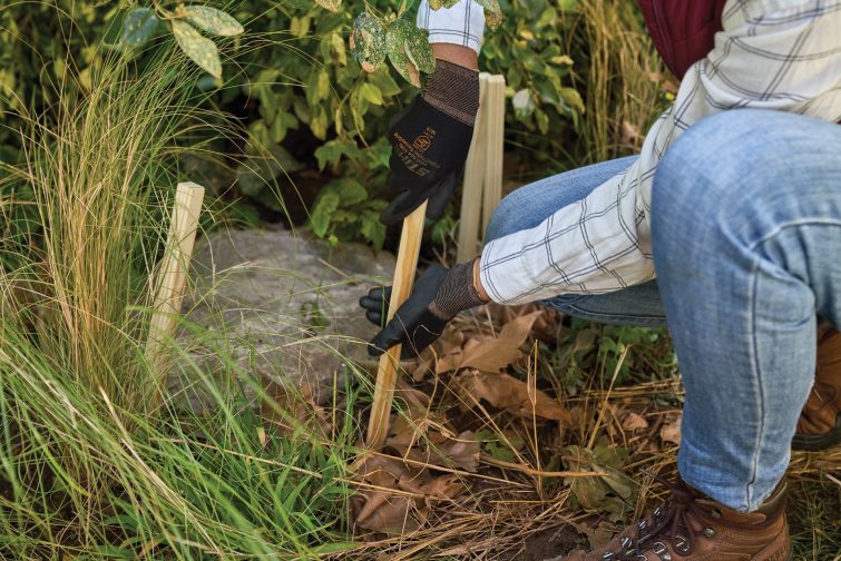 Začněte živými ploty. Pomocí hrábí nadzvedněte přerostlý plevel a nízko visící větve keřů, abyste zjistili, co všechno se pod nimi skrývá – objeví se kameny, pařezy nebo nerovný terén, který by později mohl bránit v práci. Pomocí kolíků si označte, co lze odstranit. Usnadňuje to následující práci, zvyšuje bezpečnost a chrání nástroje proti poničení.