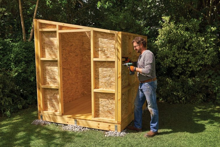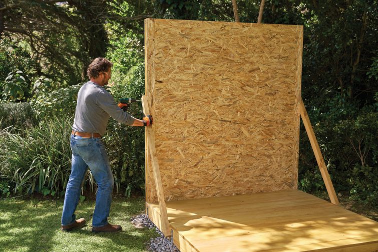 Teď je čas obrátit pozornost ke zdem. Stejně jako u základny sešroubujte nejdřív rámy. K rámům poté připevněte OSB desky. Nezapomeňte přitom na prostor pro zárubně a okna v plánovaných stěnových prvcích.