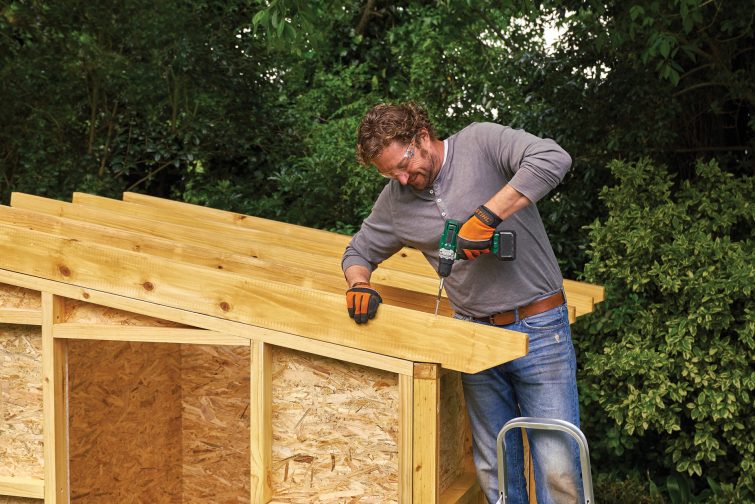 Před připevněním vnějšího opláštění a dveří potřebuje kůlna střechu. První krok: do krokví udělejte pomocí dláta a kladiva malé zářezy, kam později necháte dosednout prkna.