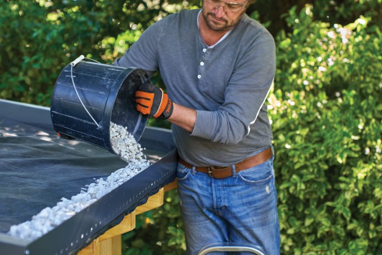 Nyní můžete začít plnit střechu. Nejprve rozptylte štěrk jako drenáž kolem okrajů a vnitřek vyplňte substrátem.