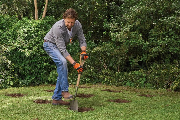 Vyhlubte za pomoci rýče body pro základnu. V závislosti na plánované velikosti přístřešku si naplánujte počet bodů. My máme devět.