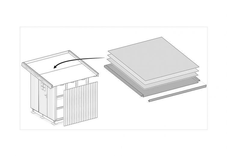 Namontujte okraje střechy na přední, zadní a boční stěny jejich zašroubováním zespodu skrz OSB desku.