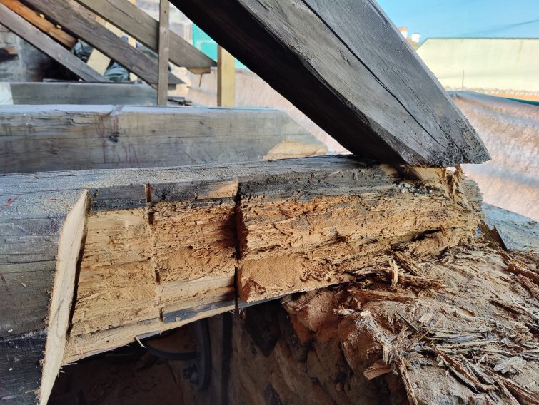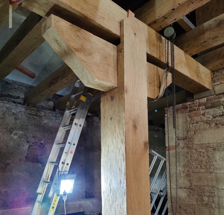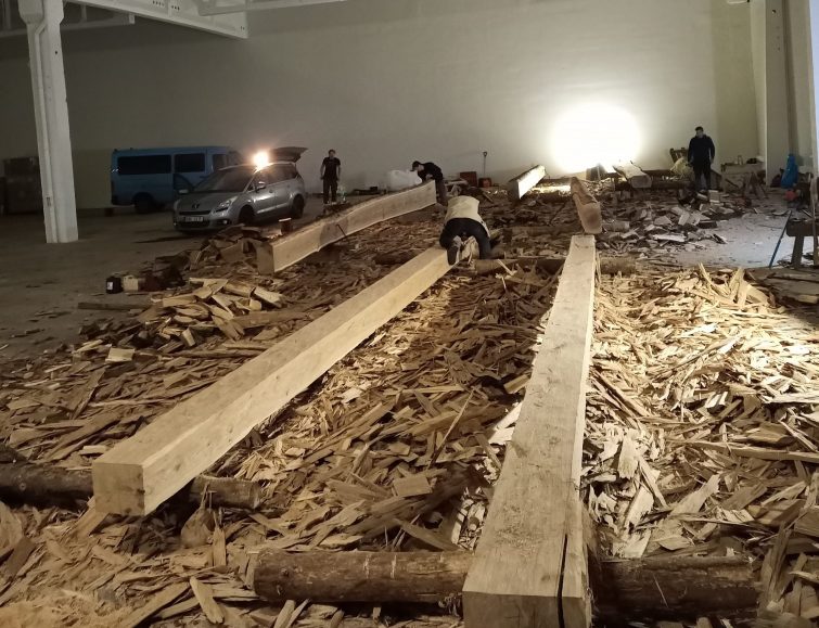 Každý kus dřeva, který sem přišel, se opracovával sekerou ručně. „Stropní trámy, které jsme použili, mají rozměr 29 na 26 centimetrů a délku 8,5 metru. Když jsme to měřili, tak jenom čištění každého z nich chtělo 28 až 30 tisíc ran sekyrou.“