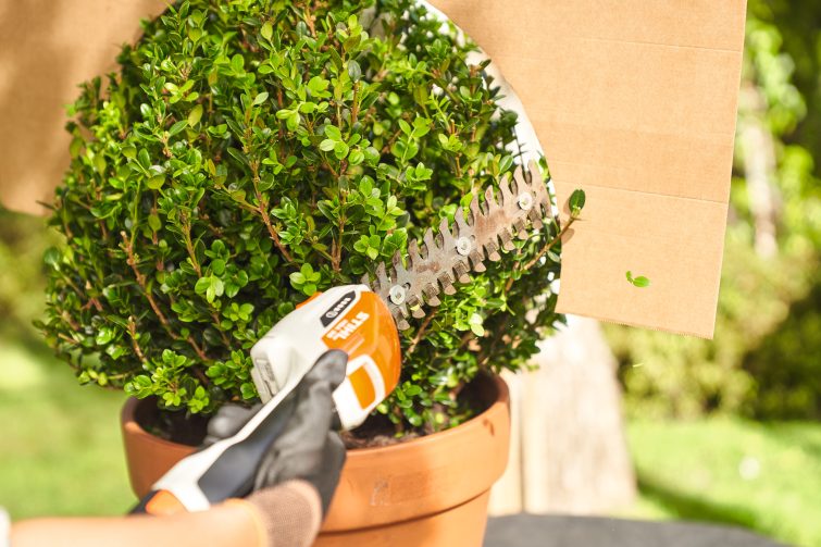 Změřte pomocí provázku přivázaného na tužce průměr rostliny a určete její poloměr. Držte šňůru na okraji lepenky a poté namalujte na lepenku půlkruh. Vystřihněte šablonu podél čáry a připevněte ji ke květináči. Nachystejte si nůžky HSA 26. Vezměte šablonu za vnější stranu jejího okraje. Všechny výhonky, které ji převyšují, odstřihněte. Po každém řezu posuňte karton o kousek dál a změňte úhel, dokud nevznikne koule. Poté rostlinou silně zatřeste, ať z ní vypadnou všechny řízky.