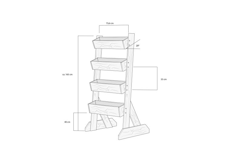 Nyní se se svým výrobkem přesuňte na místo, kam ho budete chtít finálně umístit. Přeprava hotové vertikální zahrady by později mohla být příliš náročná. Rozměřte si na obou bočních stojanech, kam připevníte dřevěné truhlíky, aby byly umístěny rovně. Spodní truhlík by měl být ve výšce 40 cm od země a jednotlivé truhlíky by od sebe měly být vzdálené 35 cm. Aby mohla dobře odtékat přebytečná voda, připevněte truhlíky se sklonem 20°.