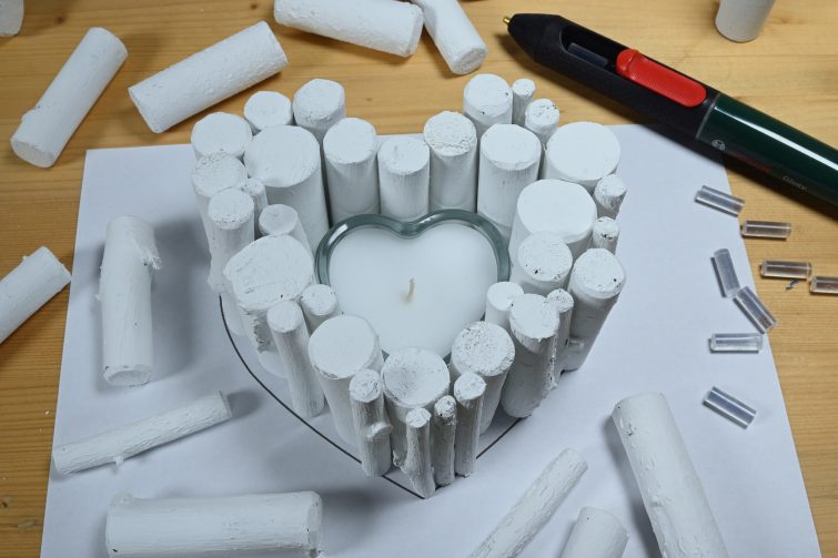 První vrstvu přilepte k sobě lepicí pistolí, ale nikoli ke sklu. Svíčka musí zůstat vyjímatelná, aby bylo možné ji vyměňovat. Šablona vám pomůže naskládat nabarvené klacíky do požadovaného tvaru. Zároveň dbejte na to, že svíčka musí být vyšší než dřevěné srdce, aby omylem nedošlo k zapálení celé dekorace nebo ohoření dřeva nejbližšího ke svíčce. Pokud je svíčka nebo její skleněný obal nižší, vytvořte v prostoru na svíčku v požadované výšce pomocí dvou klacíků dno. Svíčku nikdy nenechávejte hořet bez dozoru.