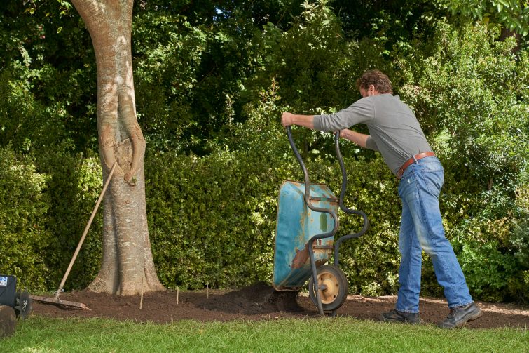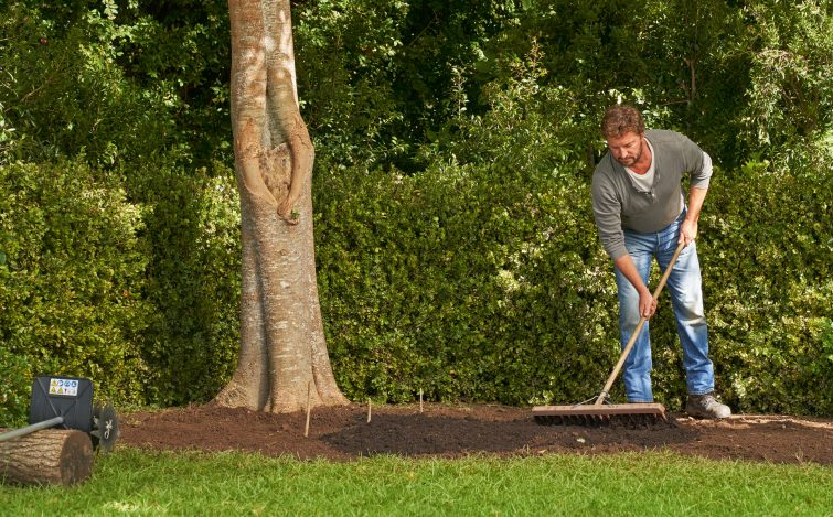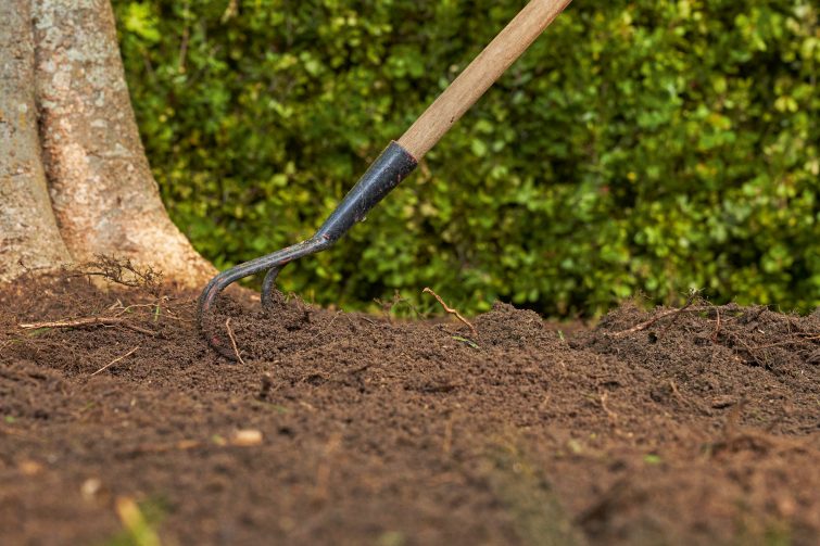 V místech, kde nejsou žádné kořeny stromu, použijte kultivátor nebo kypřič, který během okamžiku promíchá humus se zahradní zeminou a vytvoří drobivou půdu ideální pro výsadbu. Pokud je to potřeba, vyrovnejte nerovnosti pomocí dřevěných hrábí.