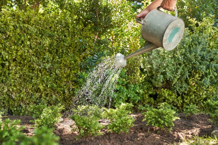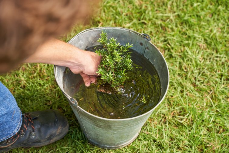 Ještě před výsadbou půdopokryvné rostliny důkladně zalijte. Ideálně je ponořte do kbelíku s vodou a nechte je tam, dokud se nepřestanou tvořit vzduchové bubliny. Tak budete mít jistotu, že je kořenový bal zcela nasáklý vodou.